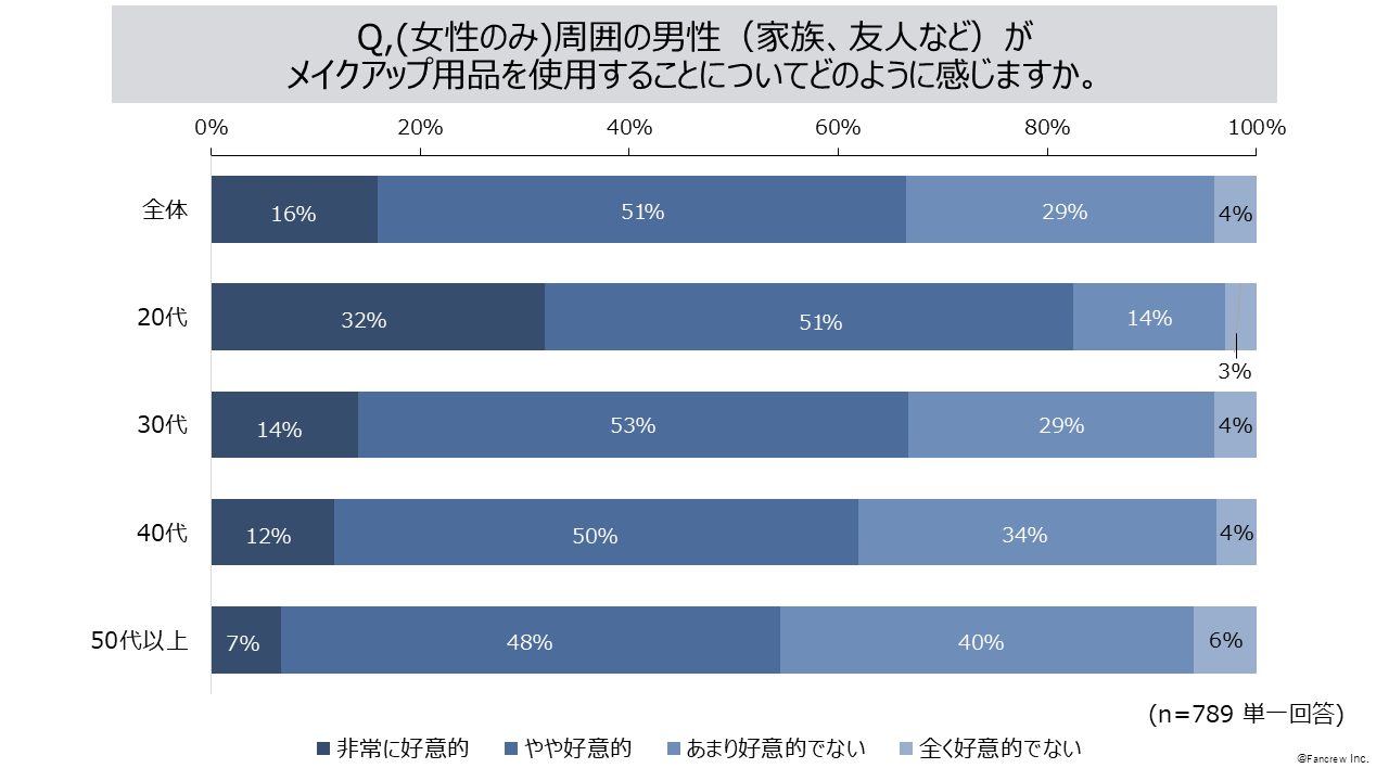 3.(女性のみ)周囲の男性(家族、友人など)がメイクアップ用品を使用することに対して「非常に好意的」「好意的」67%