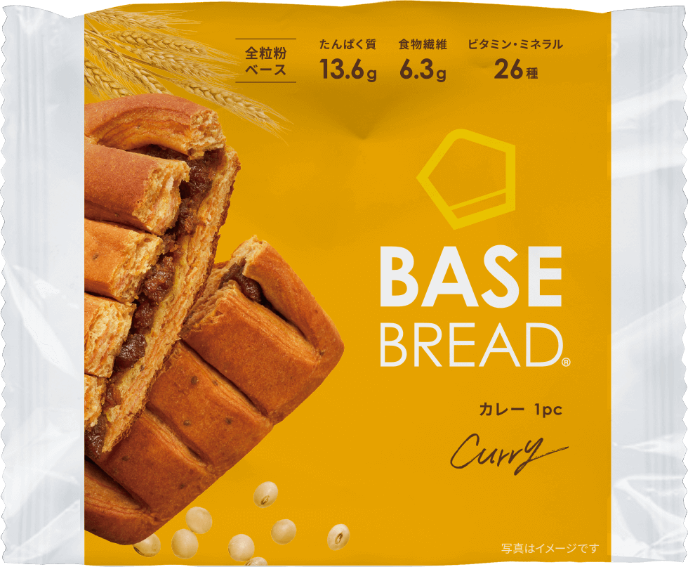 「かんたん・おいしい・からだにいい」をコンセプトに、1食(2袋)で1日に必要な33種類の栄養素の1/3がバランスよくとれる「BASE BREAD」シリーズ。「BASE BREAD カレー」は「食事感のあるラインナップがほしい」「甘いパン以外の選択肢を増やしてほしい」という声を受け、2021年2月にBASE BREADシリーズの総菜パン第一弾として発売後、2023年9月に大型リニューアル。炒め玉ねぎの甘みをベースにしたスパイスが効いたカレーを、全粒粉や大豆を使用した生地で包んだ「揚げない」ベイクドカレーパンは、ヘルシーなのに満足感ある味わいのカレーパンとして人気の高い商品です。さらに、独自の水分コントロールや製法、原材料に酢を使用するなどの工夫により、総菜パンの常識を破り、常温で約1ヶ月の保存を可能にしたロングライフパンです。
