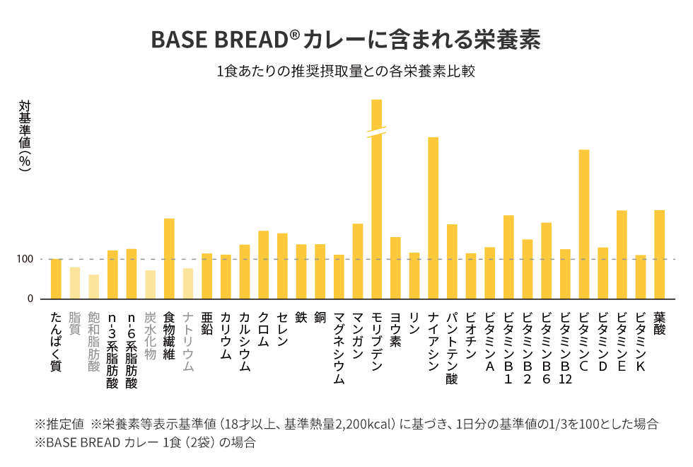 *1 1食分(BASE BREADは2袋、BASE Cookiesは4袋、BASE YAKISOBAは2個、BASE RAMENは2個、BASE Pancake Mixは1袋と卵Mサイズ1つ、牛乳(成分無調整)100mlを使用して調理した場合)で、栄養素等表示基準値に基づき、脂質・飽和脂肪酸・炭水化物・ナトリウム以外のすべての栄養素で1日分の基準値の1/3以上を含む。
