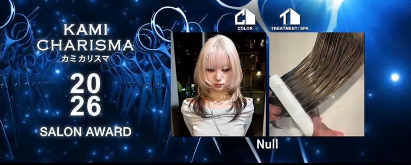 株式会社Null(本店:東京都港区、代表取締役:松岡諒、内海風我、読み:ヌル、以下「当社」)は、美容業界の権威のあるアワード『KAMI CHARISMA 2026 アワード』のサロン部門にて2冠(ヘアカラー部門、トリートメント部門)受賞、美容師部門にて代表の内海風我(フウガ)がカラー部門2つ色を受賞しましたことをお知らせいたします。