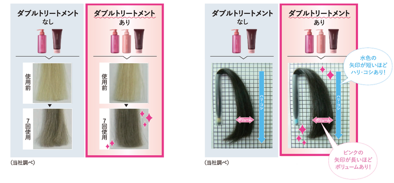 *毛髪を垂直に立て、毛髪の状態を可視化。“ダブルトリートメント”をした毛髪の方が、よりハリやコシ、ボリュームがアップしていることを確認しました。(下図・右)