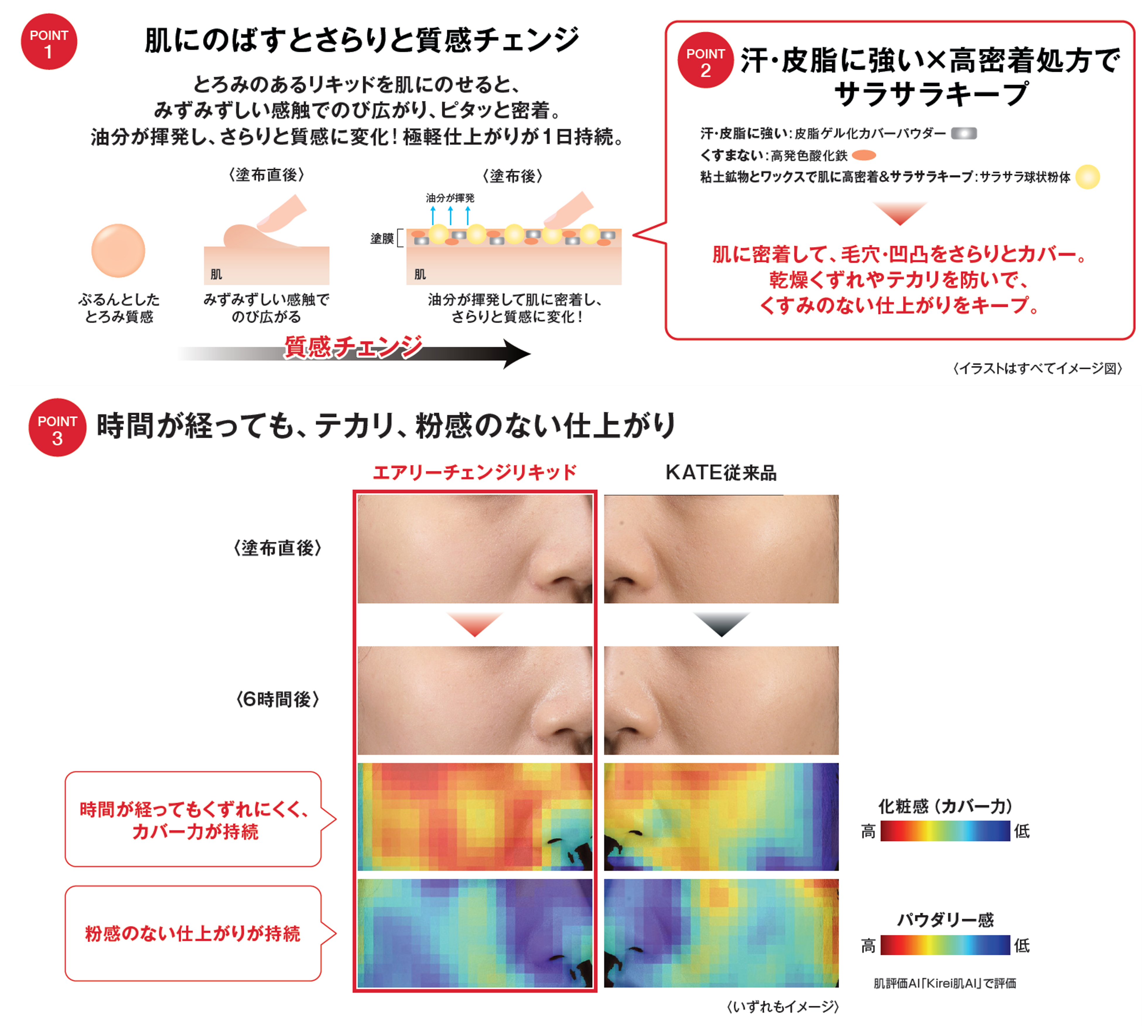 そこでKATEは、塗布時はみずみずしくのび広がり、肌に密着するとさらりとした質感に変化する処方を採用。テカリや乾燥くずれを防ぎ、極軽仕上がりをキープする新リキッドファンデーションを開発しました。