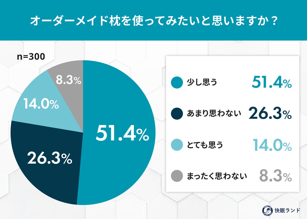 今回の調査から、オーダーメイド枕は広く知られている一方で、実際に使ったことがある人は少なく、関心と使用経験の間に大きな差があることが分かりました。「使ってみたい」と感じている人は多いものの、価格や購入時のハードルが高く、行動に移せていない層が多いと考えられます。また、求められているのは高級感よりも、「自分に合った高さ調整」や「首・肩への負担軽減」といった実用的な効果です。オーダーメイド枕は、必要性を感じながらも手が届きにくい“高価格帯の選択肢”として認識されており、より試しやすい形での提供が今後の課題だと言えるでしょう。