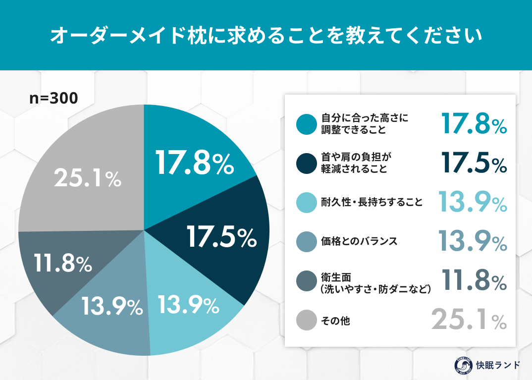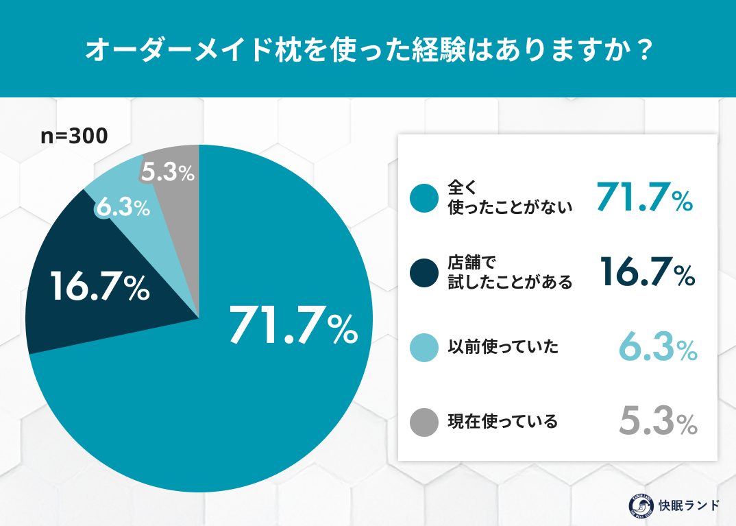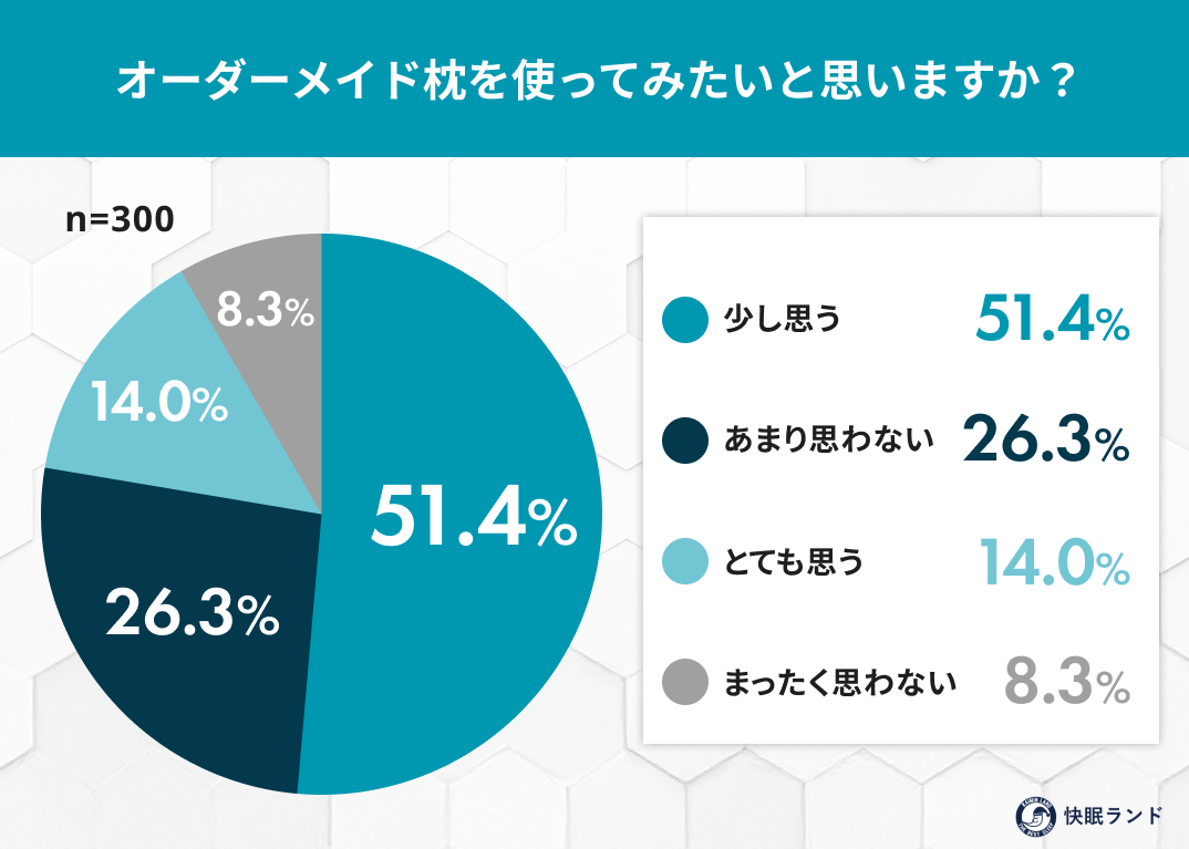 オーダーメイド枕は、自分に合いそうだと感じながらも、「価格が高そう」「手間がかかりそう」と感じて後回しにされやすい寝具です。今回の調査でも、関心は高い一方で、実際に使ったことがある人は限られていました。オーダーメイド枕の本来の価値は、特別感ではなく「今の自分に合った状態を知ること」にあります。今使っている枕に違和感があるなら、オーダーメイドという選択肢を知ること自体が、睡眠を見直すきっかけになるかもしれません。快眠ランドでは今後も、無理なく続けられる睡眠改善のヒントを分かりやすく発信してまいります。