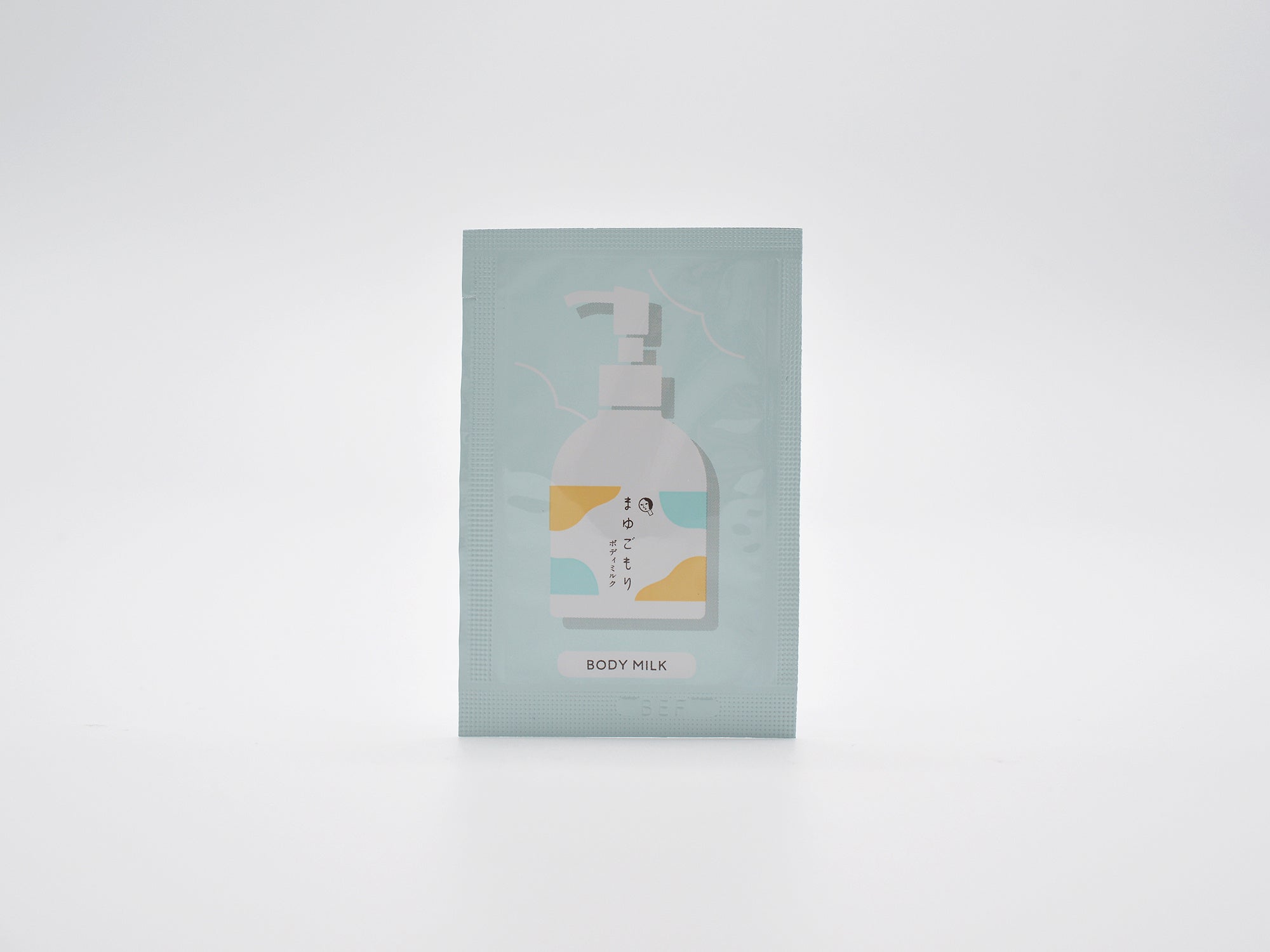 人気香りシリーズ「まゆごもり」のボディミルクのパウチサンプルと、