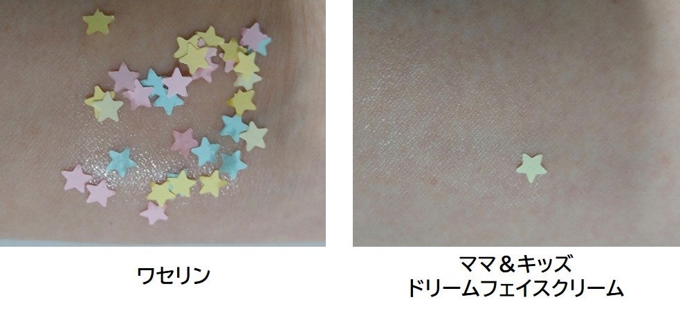 ママ&キッズ ドリームフェイスクリームは、ワセリンと比較しても塗布後の紙片の付着数が少なく、ベタつきが抑えられている。