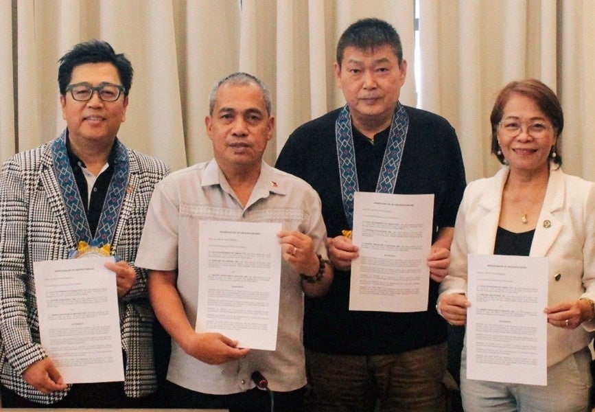 (左から)アデランス・フィリピン社 社長 千藤伸一、タバコ市 市長 レイナルド・ブラガイス氏、