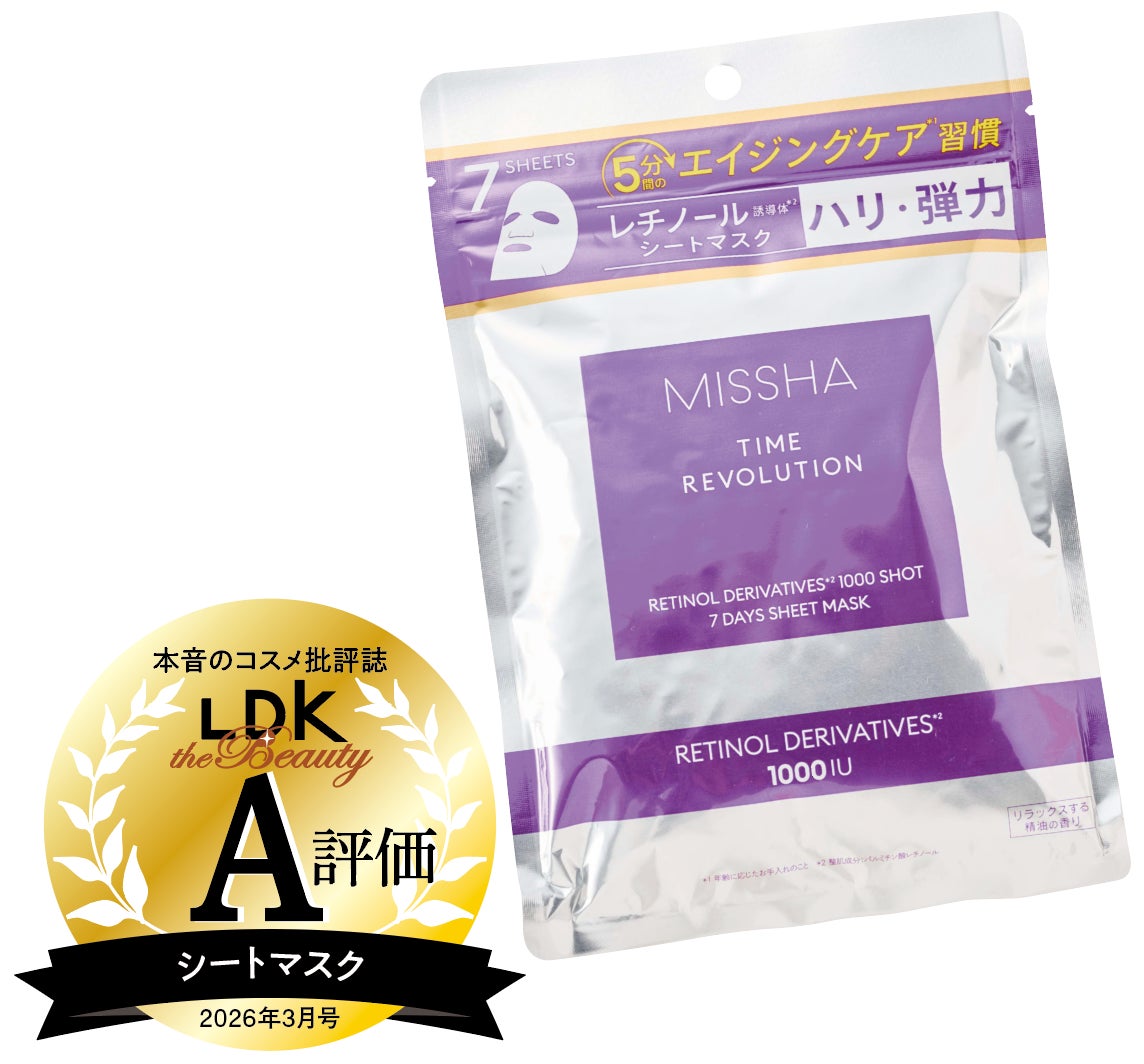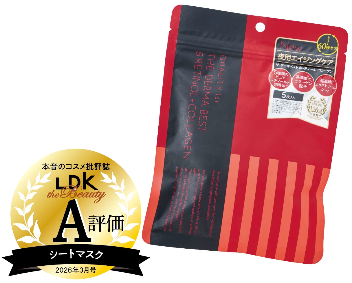 5種のレチノールと5種のコラーゲンのほか、6種のセラミド、8種のヒアルロン酸、4種のビタミンC誘導体などを配合したエイジングケアマスク。保湿力検証では高い数値を記録し、「60秒でお手入れ完了」のウリ文句に嘘なしの結果に。モニターからも「しっとり感がとてもいい」「肌がふっくらした」と好評でした。シートは分厚く肌あたり良好で、密着感あるつけ心地も◎。精油の香りに気分も癒やされます。