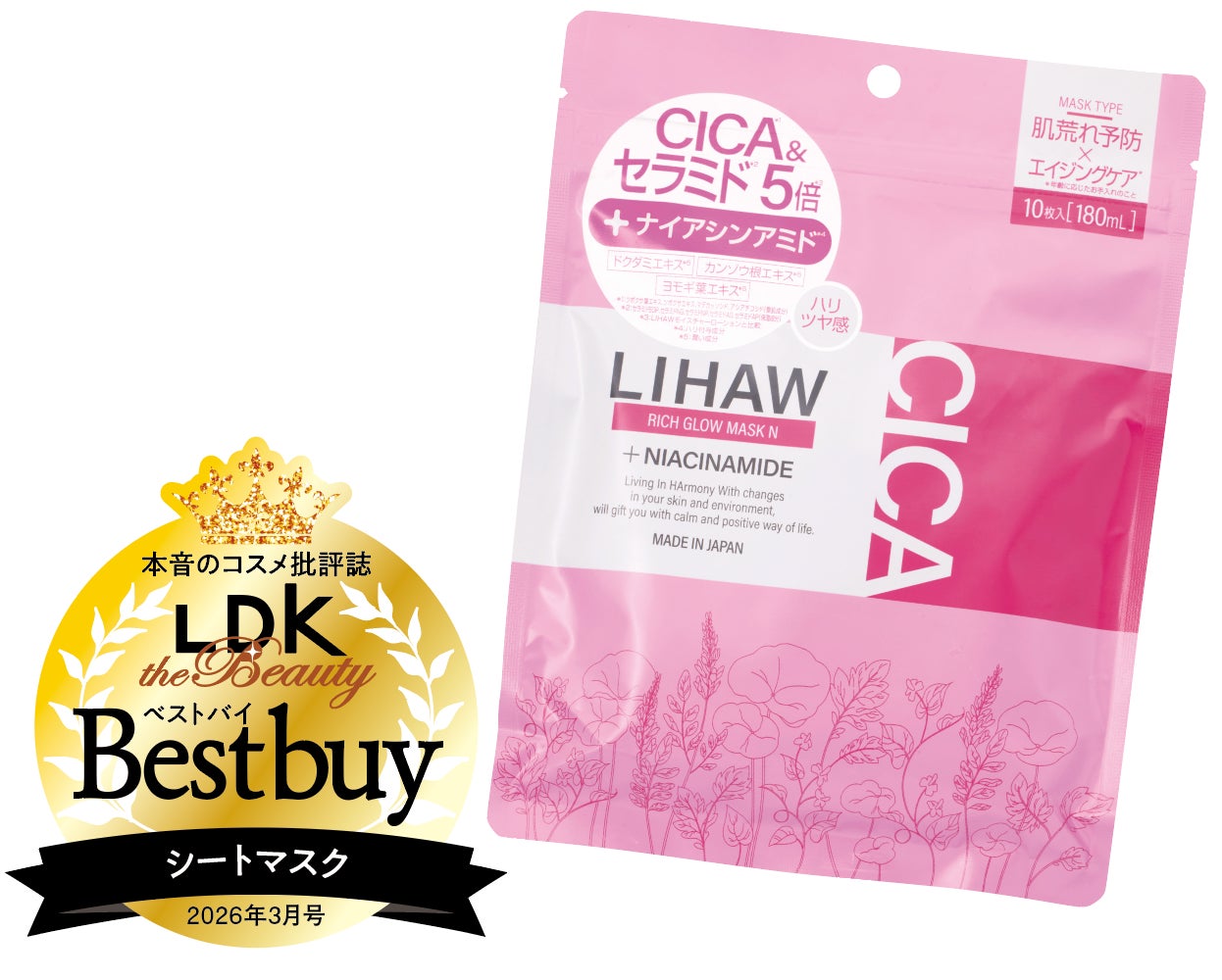 自然派スキンケアブランド・リハウ。5種のセラミド、ナイアシンアミドに話題のバクチオールも配合され、成分評価は満点。肌あたりのいい不織布系シートに、サラッとした美容液がたっぷり浸透し、ストレスフリーに広げられるのも魅力です。今回の保湿力テストではトップクラスの結果に。モニターからは「ふっくらぷるんとしてハリが出た」などと好評でした。シトラス系ハーブの香りも心地よく、リフレッシュしたい日に。