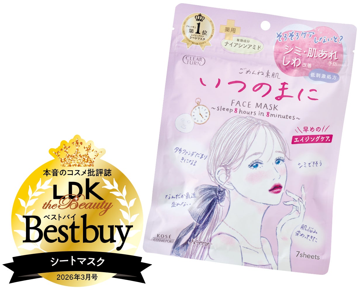 大人気の「ごめんね素肌」に、シミ予防・肌荒れ予防・シワ改善を1枚で叶えるというプレエイジングケアマスクが仲間入り。ナイアシンアミドを筆頭に、コエンザイムQ10、3種のヒアルロン酸などを配合。保湿力も優秀で、「はずしたあとはベタつくことなくしっとりし、ふっくら感も出た」の声も。シートは密着感抜群で、つけたままで作業や会話をしてもズレることなく使えました。摩擦や刺激を感じた人もおらず、文句なしのベストバイです!