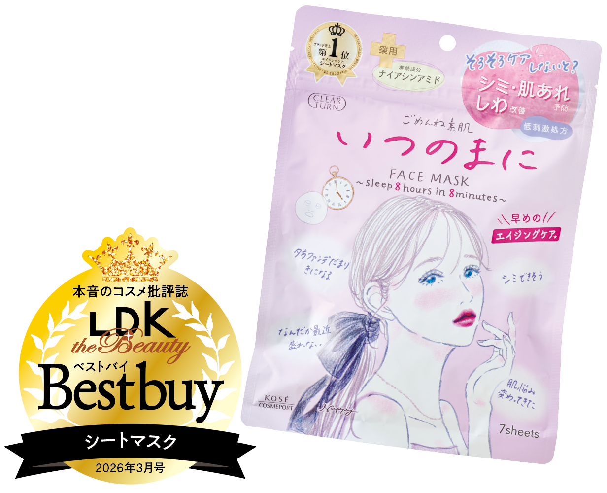 大人気の「ごめんね素肌」に、シミ予防・肌荒れ予防・シワ改善を1枚で叶えるというプレエイジングケアマスクが仲間入り。ナイアシンアミドを筆頭に、コエンザイムQ10、3種のヒアルロン酸などを配合。保湿力も優秀で、「はずしたあとはベタつくことなくしっとりし、ふっくら感も出た」の声も。シートは密着感抜群で、つけたままで作業や会話をしてもズレることなく使えました。摩擦や刺激を感じた人もおらず、文句なしのベストバイです!