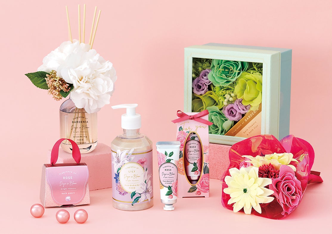 左から オイルインバスパール(バッグ)、ブルーミングリードディフューザー、ハンド&ボディーソープ、ハンド&ネイルクリーム、バスフラワーギフト、バスフラワーブーケ