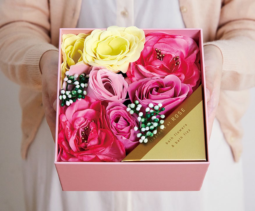 芳潤な花のアロマ香るバスフラワーをボックスに詰めた華やかバスギフト。湯船に入れてお湯を注げばモコモコ泡風呂に。使用するまで飾って、インテリアとしても楽しめます。