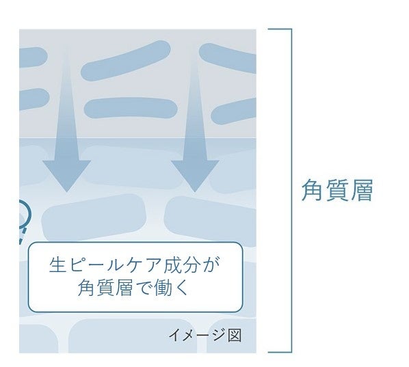 pHの影響を受けやすい生ピールケア成分※2を安定配合し、フレッシュな状態で届けることで、固くごわつきがちな肌をほぐして柔らかく整えます。角層の美しさを育み、ハリ感や透明感※3のある肌に導きます。