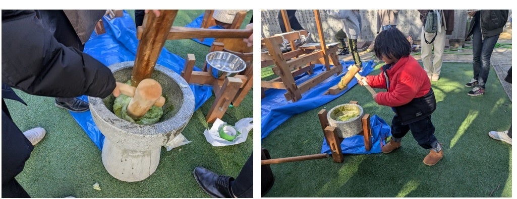 最後に、栄養満点のケールカレーを食べたり、ケールが入ったおもちをついたり、参加者全員で楽しい食事タイムを過ごしました。参加者からは、「ケールは今まで飲んだことがなかったけど、みかんジュースと一緒に飲んでとても美味しかった」「日本は野菜不足と知ったので、これからたくさん野菜を食べたり、青汁を飲もうと思った」などの嬉しい声が寄せられました。