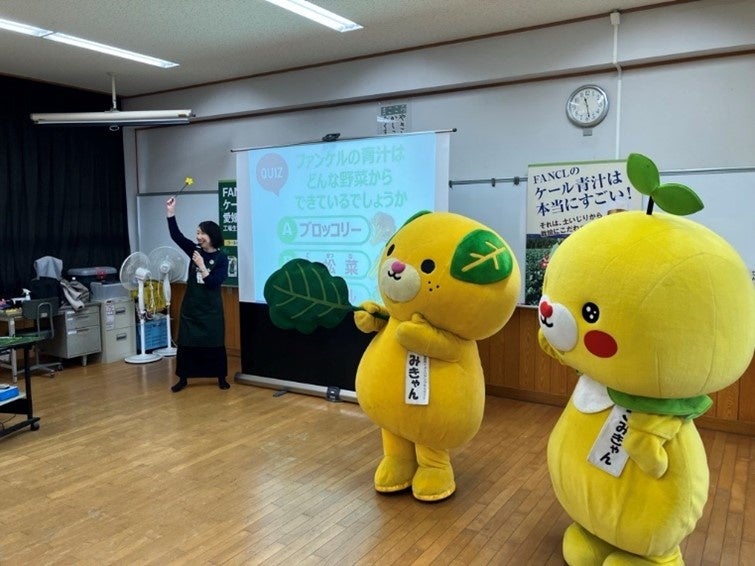 愛媛県産のケールを通じて基本栄養について学ぶ  「みきゃん」と「こみきゃん」も登場