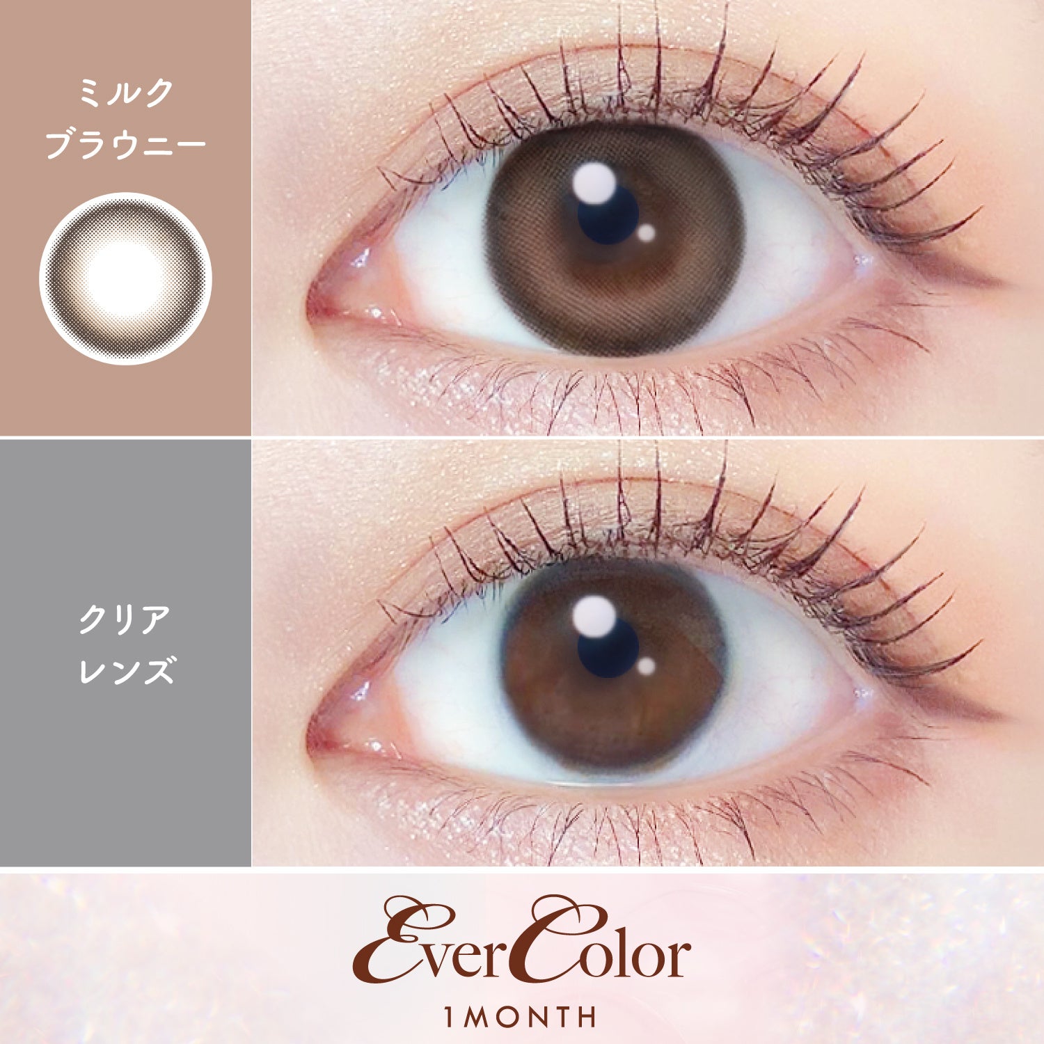 今回発売する新色2色「ミルクブラウニー」と「テディモカ」は、昨年7月に発売したワンデーカラコン「EverColor1day Natural(エバーカラーワンデーナチュラル)」の人気カラーをマンスリー化。マンスリー化を求める声にいち早くお応えして登場しました。