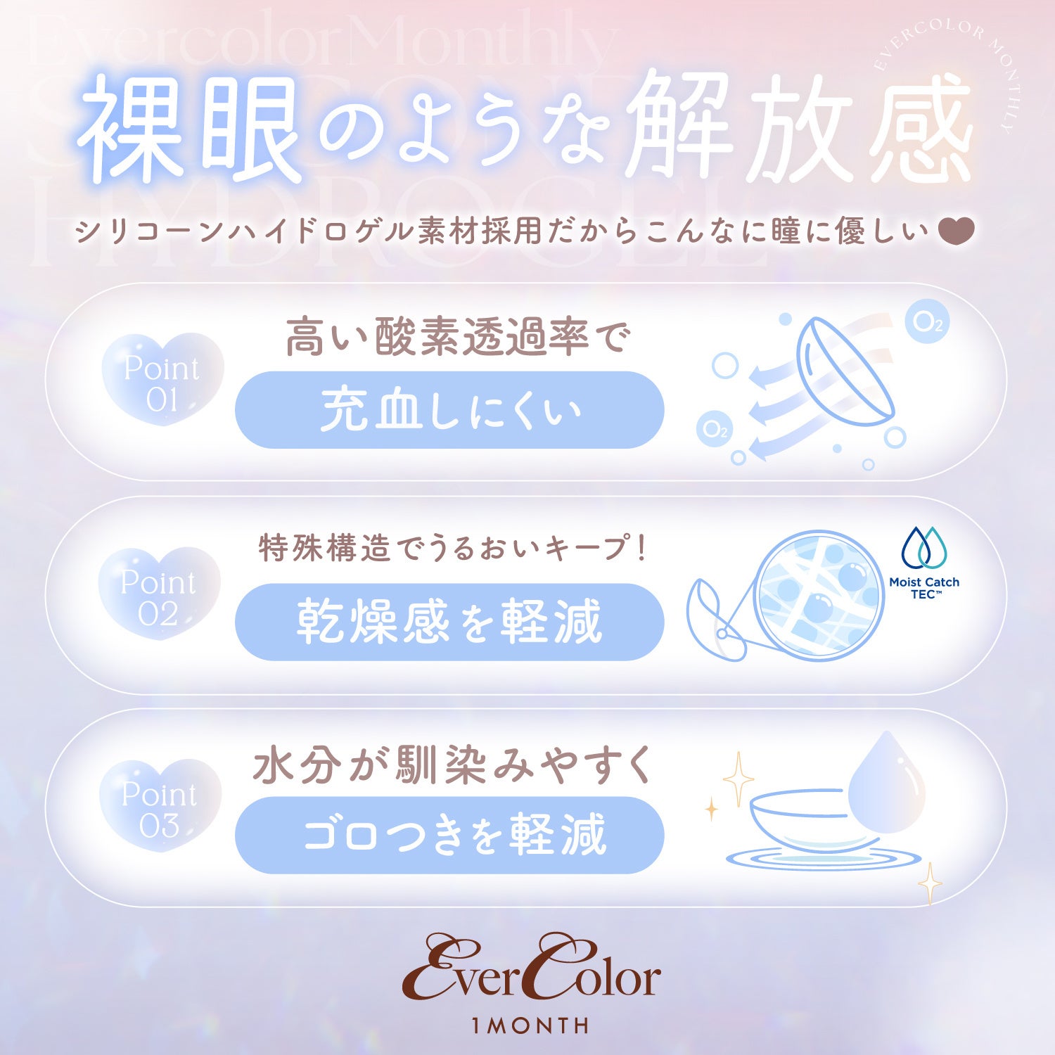 エバーカラーマンスリーは、快適なつけ心地を追求したシリコーンハイドロゲル素材を採用しています。高い酸素透過率で充血しにくく、乾燥感・ゴロつきを軽減することで、裸眼のような解放感を叶えます。