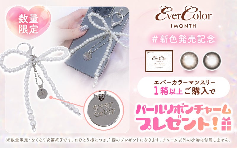 対象の店舗にて『エバーカラーマンスリー』を1箱以上お買い求め頂いたお客様に、先着でオリジナルの「パールリボンチャーム」をプレゼントいたします。