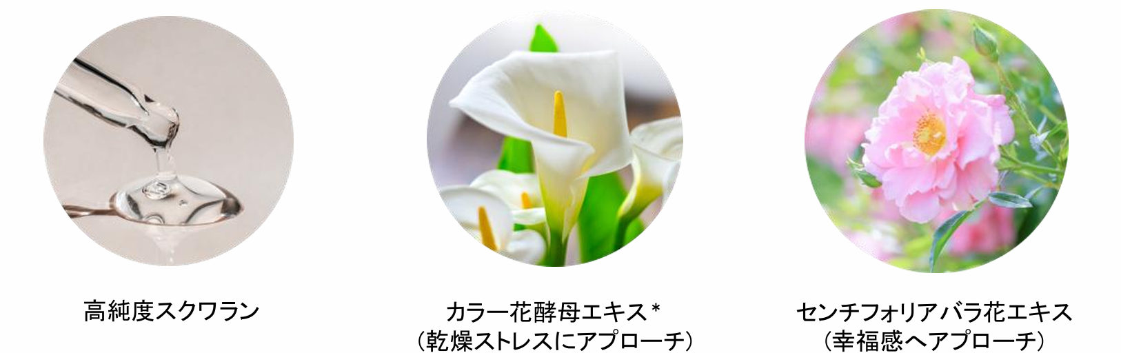 *ストレス:乾燥による *ノンケミカル処方:紫外線吸収剤不使用 *カラー花酵母エキス:加水分解酵母 ※すべて保湿成分