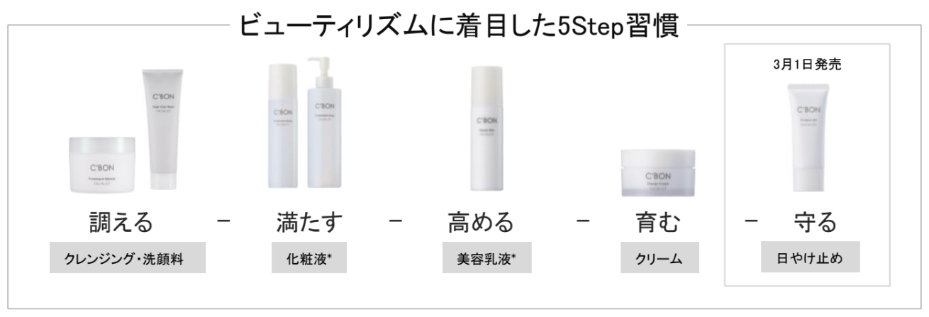 自らの肌をいたわるスキンケアタイムは、素肌のコンディションだけでなく心のリズムも調えてくれる大切な時間と考え、シーボンでは、ビューティリズムに着目した5Step習慣を提唱しています。新「フェイシャリストシリーズ」は、この5Stepに基づき、肌の基礎力にアプローチし、角層を多角的にケアして“もっちりと満ちた美肌”へ導くシリーズです。