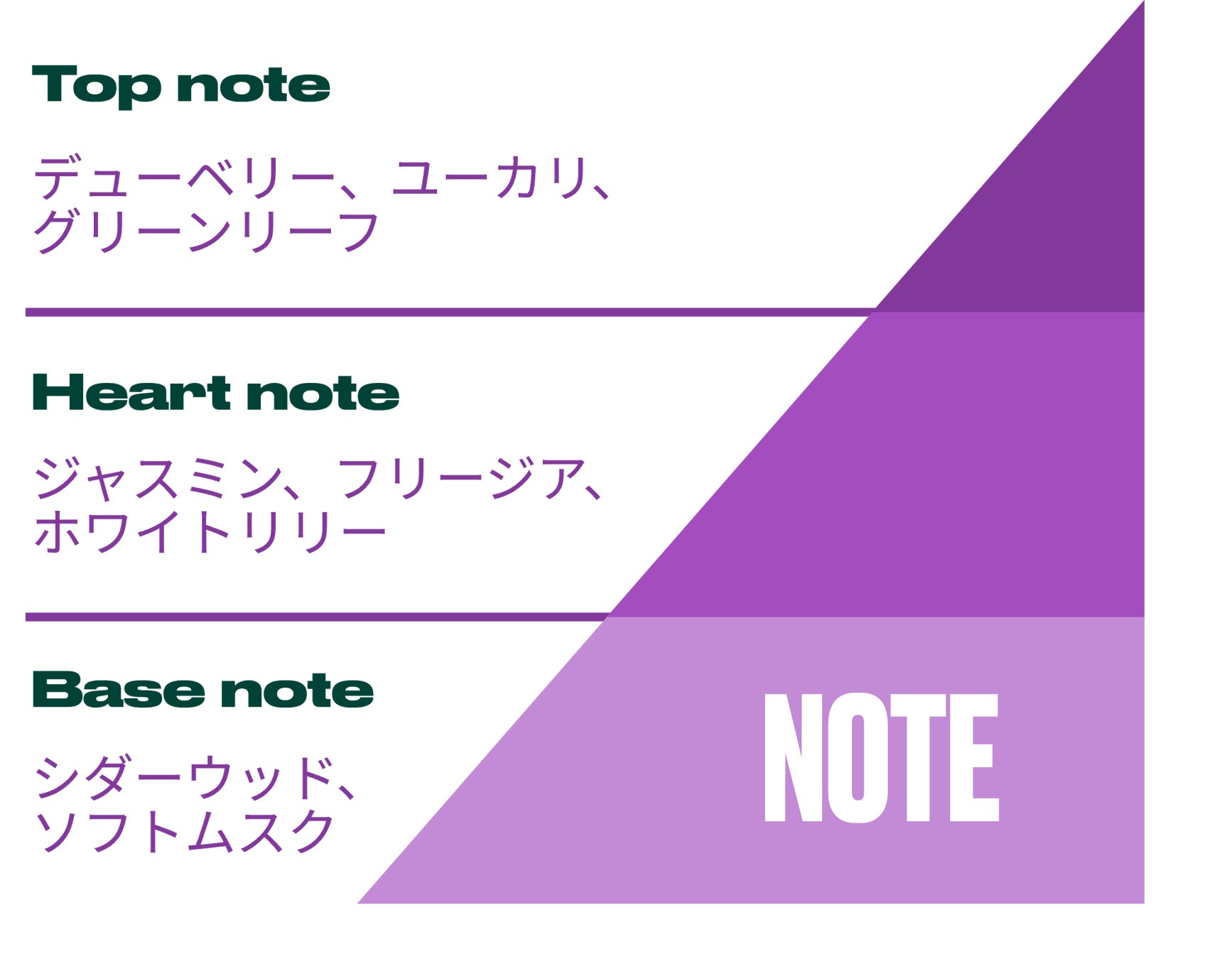 ジューシーなデューベリーのはじけるような香りに繊細なグリーンリーフとユーカリの清涼感が絡み、ジャスミン、フリージア、ホワイトリリーが花開く。どこかなつかしさも感じる、みずみずしく鮮やかなフルーティフローラルの香りはやがて、温かなシダーウッドと柔らかなムスクの心地よいベースへと落ち着きます。毎日のボディケアタイムを豊かな香りで彩るシリーズです。