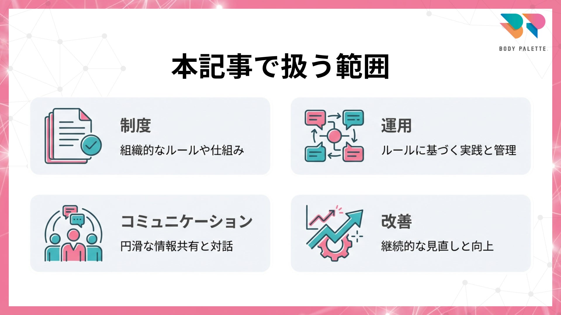 具体的な制度文案、運用手順、管理職向けの具体フレーズ、テンプレート、チェックリスト本文は掲載せず、企業ごとに設計すべきポイントを中心に整理します。