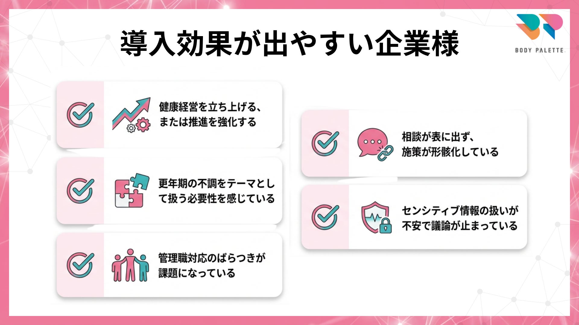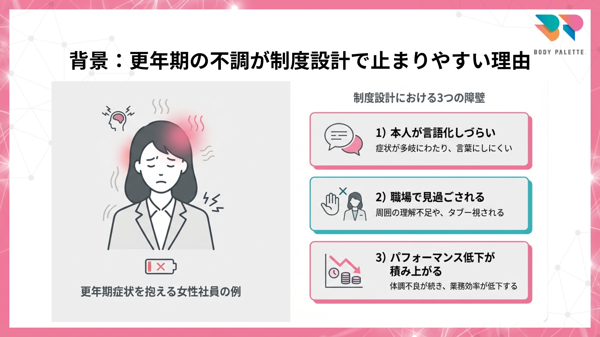本記事は、更年期の不調に対して企業が取り組む際の「整理の型」を提示するものです。