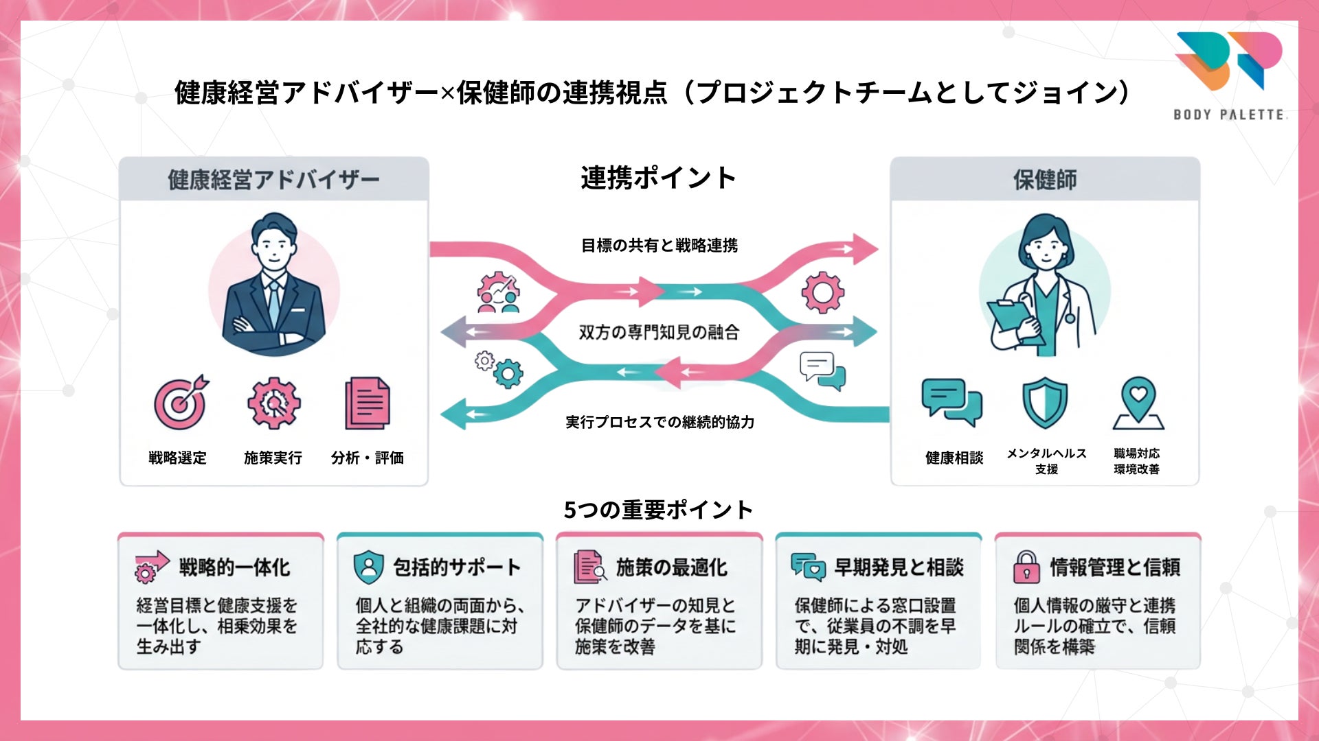 健康経営の推進視点(意思決定・実装の回し方)と、保健師の視点(相談導線・守秘・現場対応の現実解)を合わせ、企業ごとに設計することが重要になります。