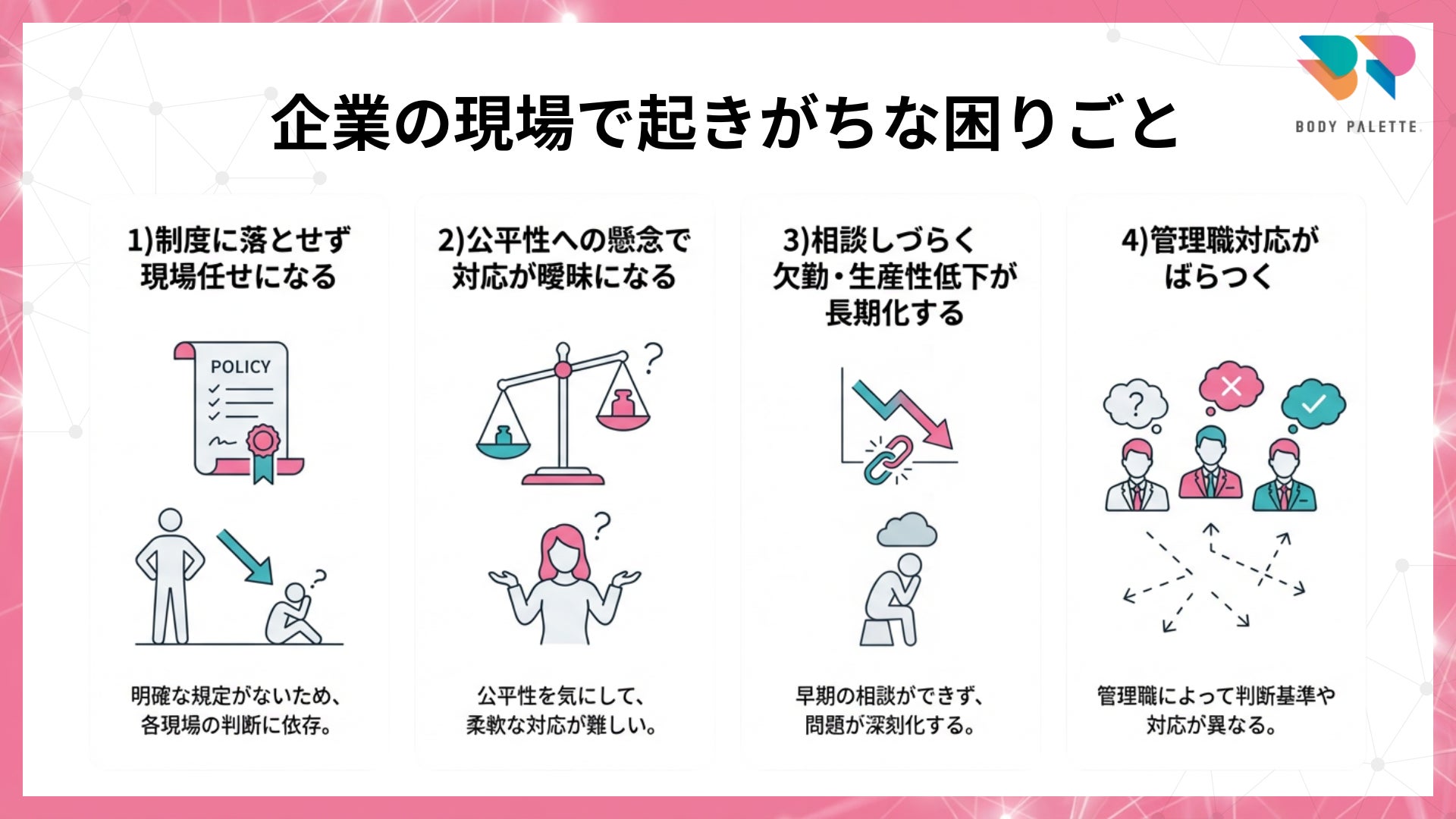 企業側は、配慮と公平性の線引き、センシティブ情報の取り扱い、管理職の対応のばらつきといった論点が絡み合い、制度や運用が固まらず、議論が止まりやすくなります。