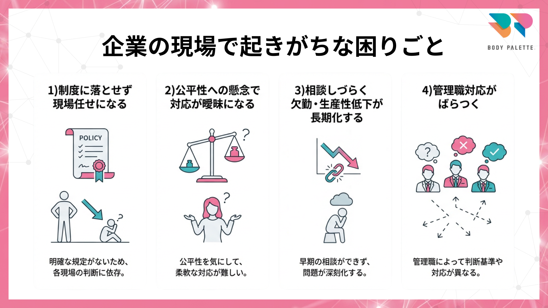 ・本人が相談しづらく、結果として欠勤・遅刻・生産性低下が長期化する