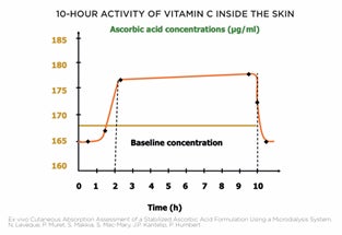 たとえば、NextGen®(ネクストジェン)テクノロジーにより安定化したL-アスコルビン酸は、40℃環境で3ヶ月間、皮膚内でも10時間以上の活性が持続することが実証されています。