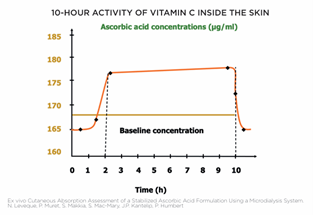 NextGen®(ネクストジェン)テクノロジーによりL-アスコルビン酸は皮膚内部でも活性が10時間持続したデータも出ています。