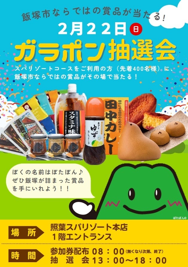 照葉スパリゾート本店にてスパリゾートコースをご利用の方(先着400名様)に、飯塚の特産品がその場で当たる無料ガラポン抽選会の参加券を配布します。