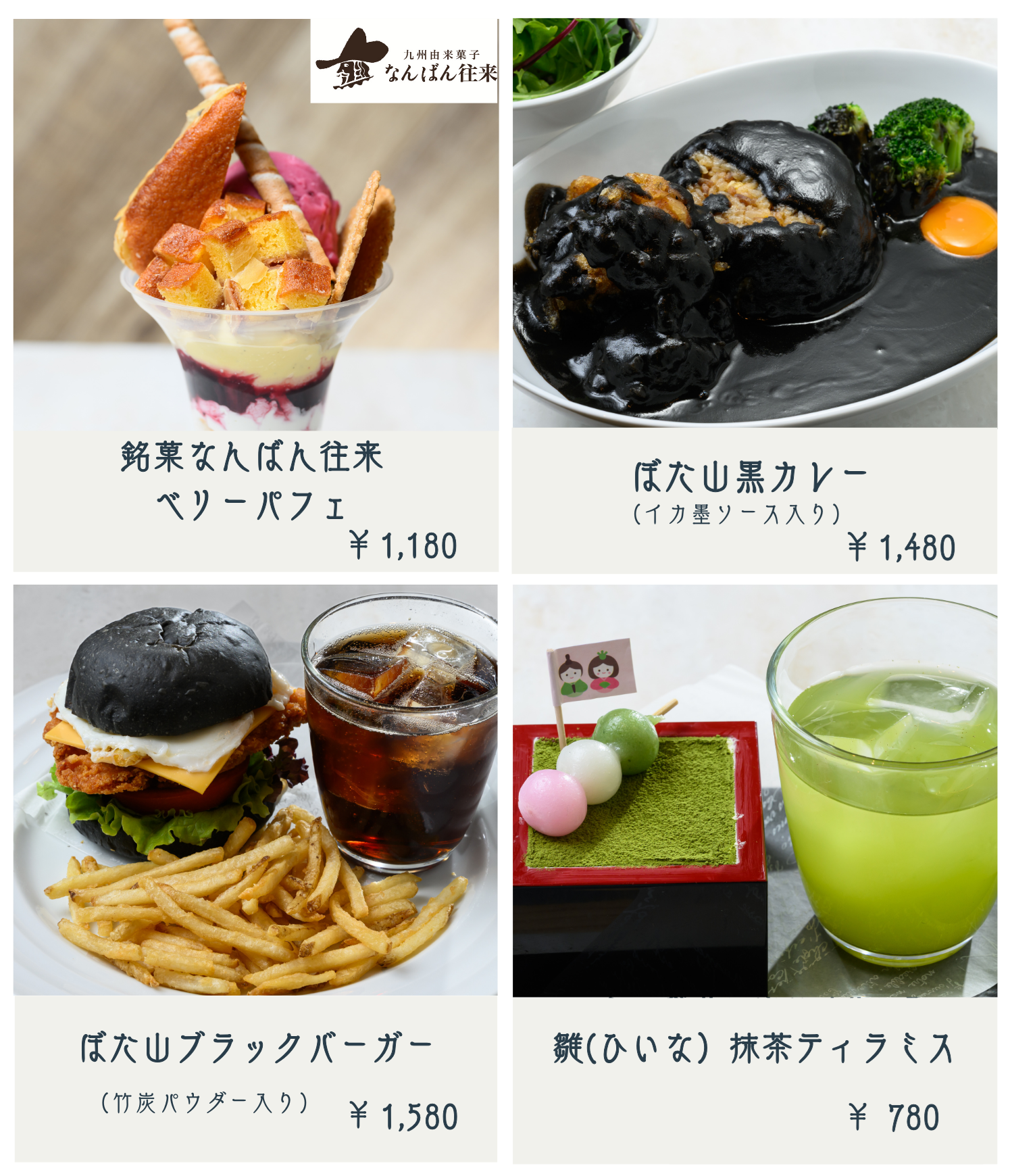 飯塚市発祥の菓子店「さかえ屋」の銘菓「なんばん往来」を用いたオリジナルスイーツのほか、「ぼた山カレー」「雛(ひいな)抹茶ティラミス」など、飯塚にちなんだメニューをお楽しみいただけます。