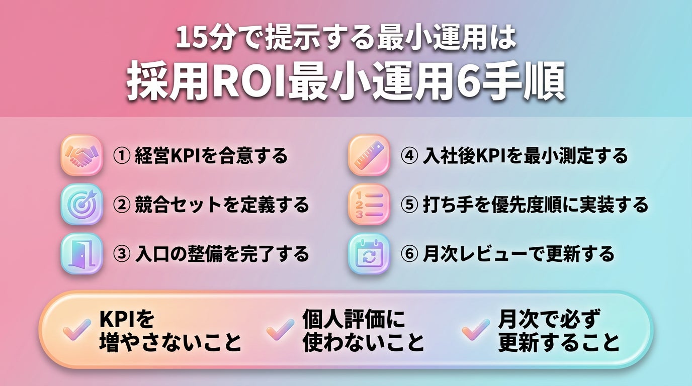 15分で提示する最小運用は「採用ROI最小運用6手順」です