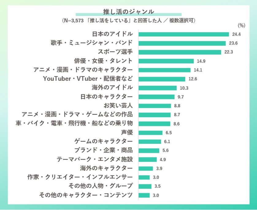 推しのジャンルは、「日本のアイドル」の回答が24.4%と最も多く、次いで、「歌手・ミュージシャン」が23.6%、「スポーツ選手」が22.3%だった。