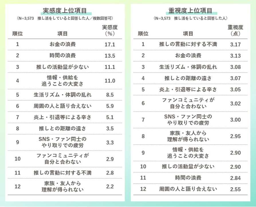 推し活をしている人に、直近1カ月以内に推し活を通じて実感したネガティブなことを聴取した。1位は「お金の浪費」(17.1%)、次いで「時間の浪費」(13.5%)となった。