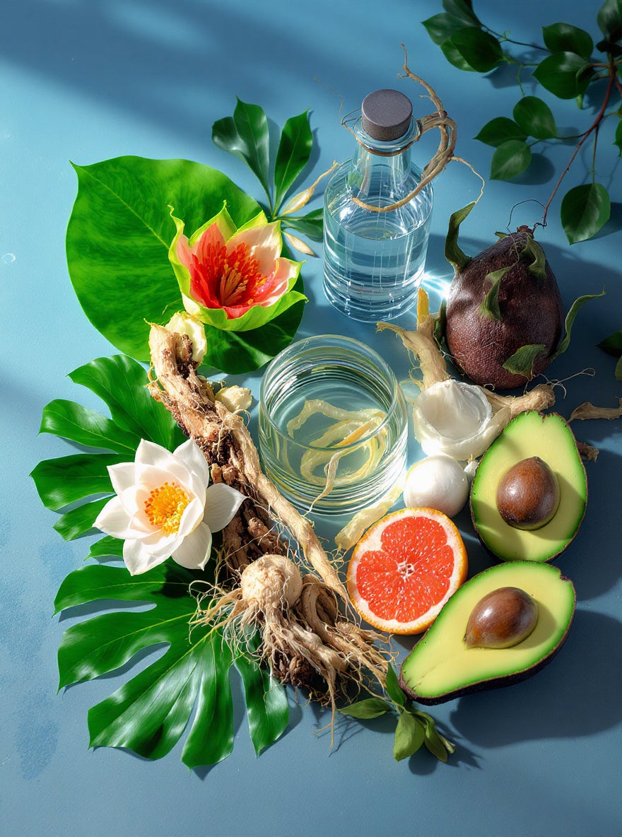 グアバの葉、サトウキビの水、ノニの根、ハスの花、高麗人参、グレープフルーツの皮、ドラゴンフルーツ(果実)、アボカド(果実)
