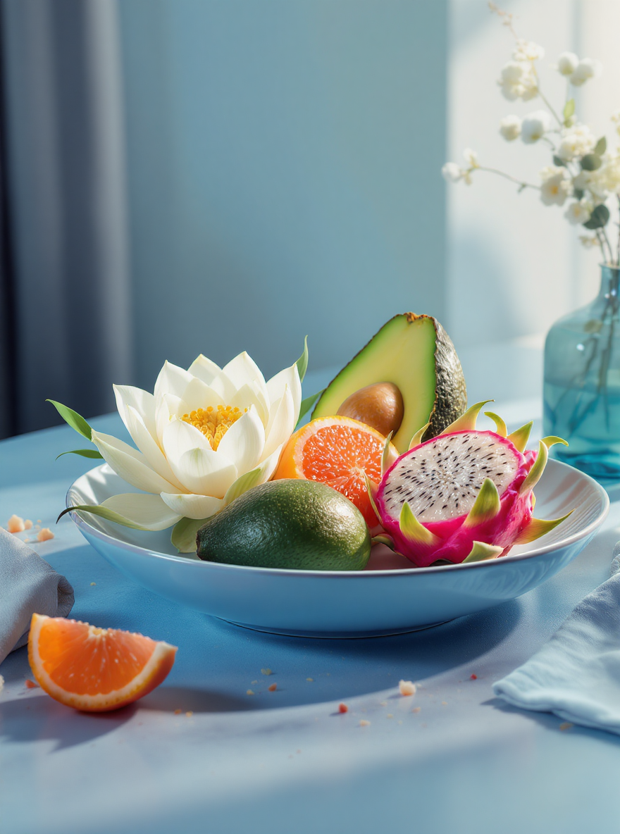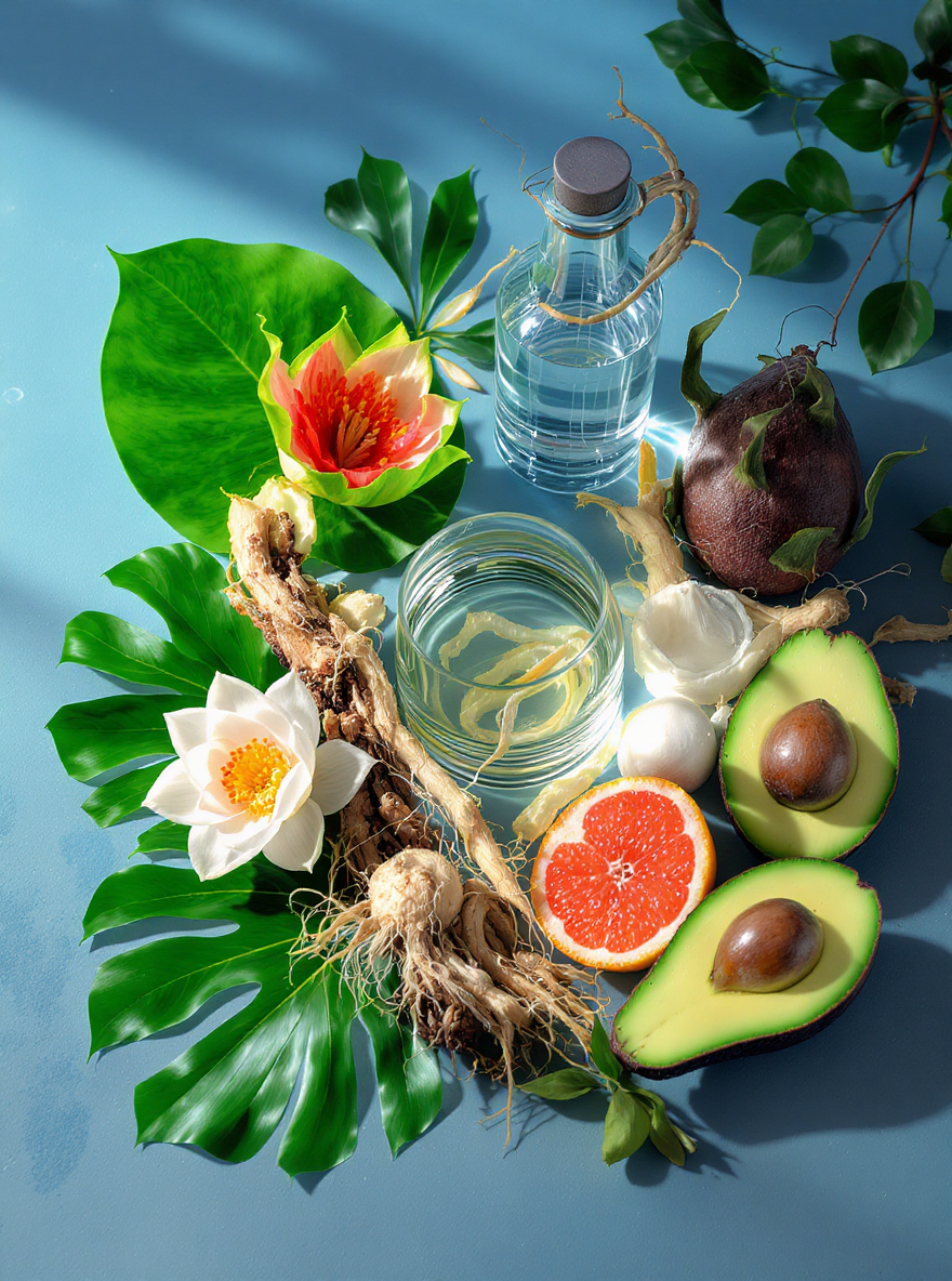 グアバの葉、サトウキビの水、ノニの根、ハスの花、高麗人参、グレープフルーツの皮、ドラゴンフルーツ(果実)、アボカド(果実)