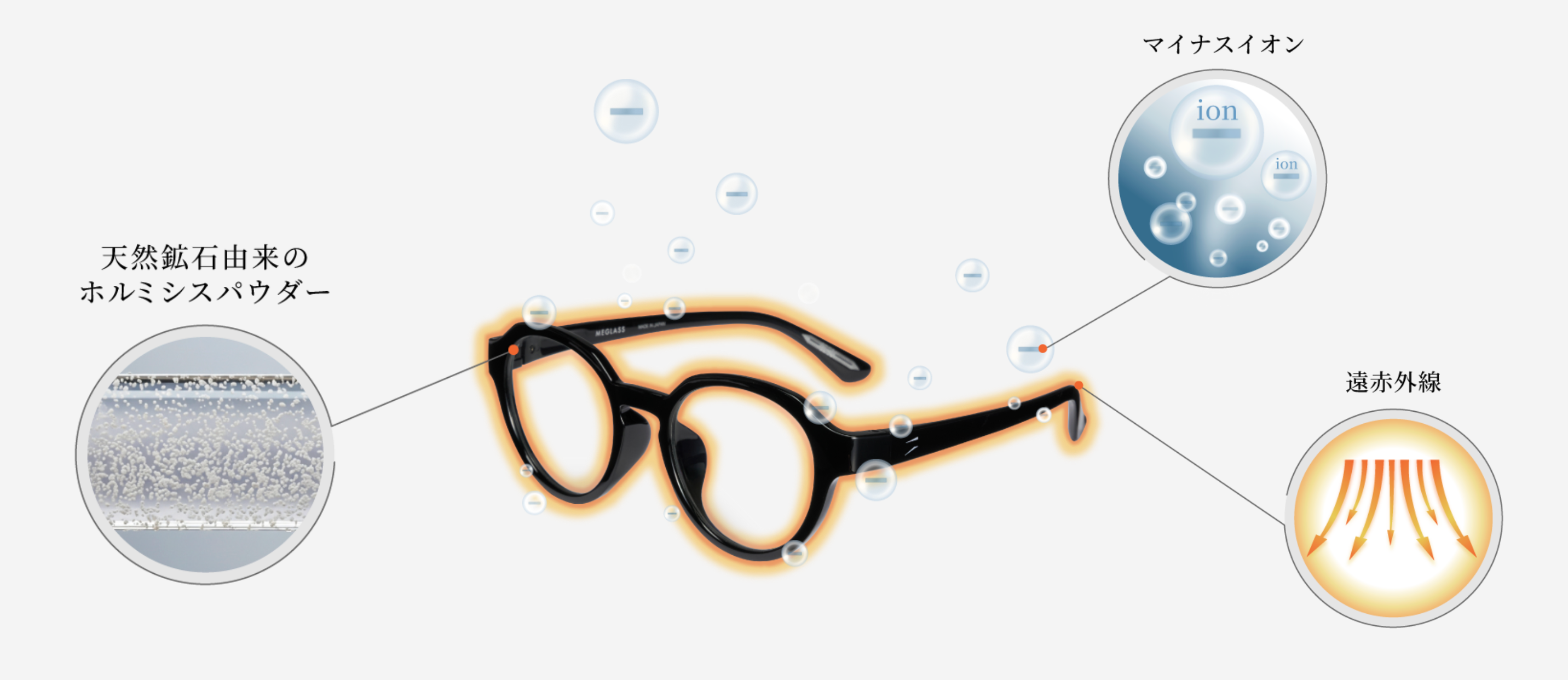 MEGLASSのフレームに配合された天然鉱石は、遠赤外線をわずかに放射する特性があります。 遠赤外線は、“温泉”“岩盤浴”“湯治文化”にもゆかりがあり、からだを“じんわりと包み込むような温かさの波長として知られています。