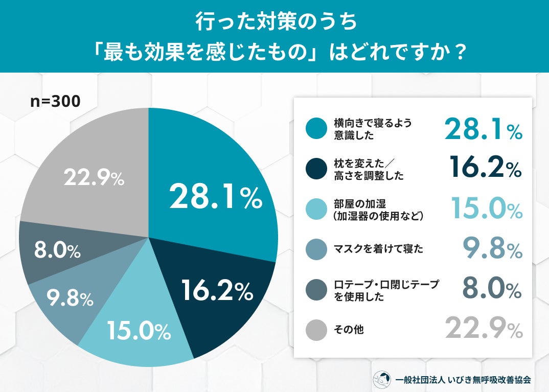 最も効果を感じた対策でも「横向きで寝る」が28.1%でトップ