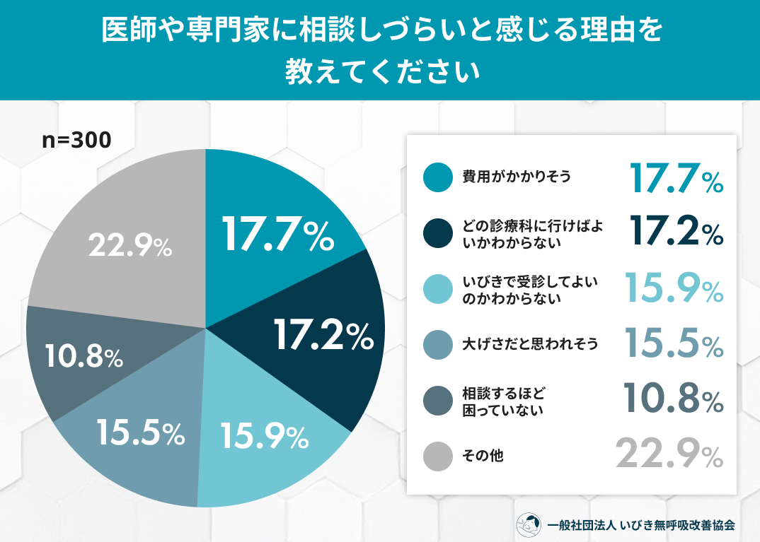 → 「どこにかかればよいかわからない」「いびきで受診してよいのかわからない」といった情報不足や心理的ハードルが、相談の妨げになっていることが読み取れます。