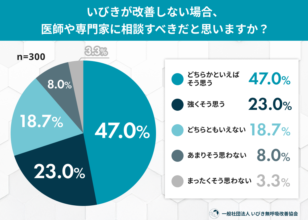 いびきが改善しない場合、約7割が「医師や専門家に相談すべき」と認識