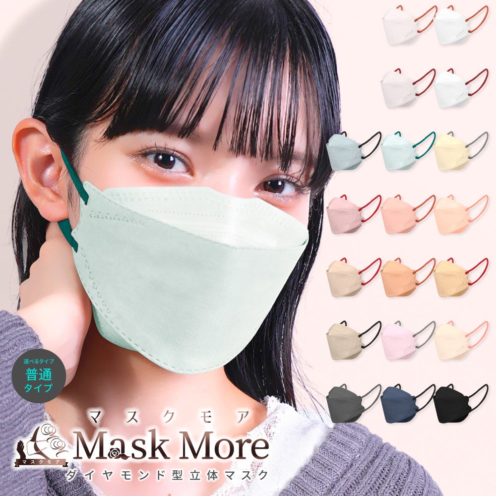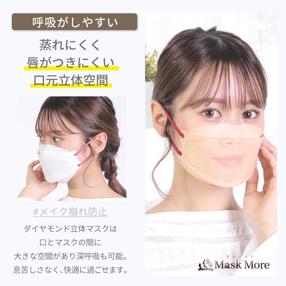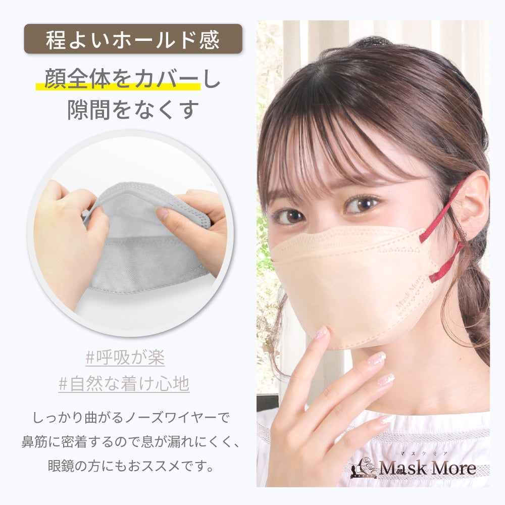 マスクモアの立体マスクは、柔らかく伸びのある太めの耳紐を採用し、耳への圧力を分散することで長時間着用しても負担を感じにくい設計です。