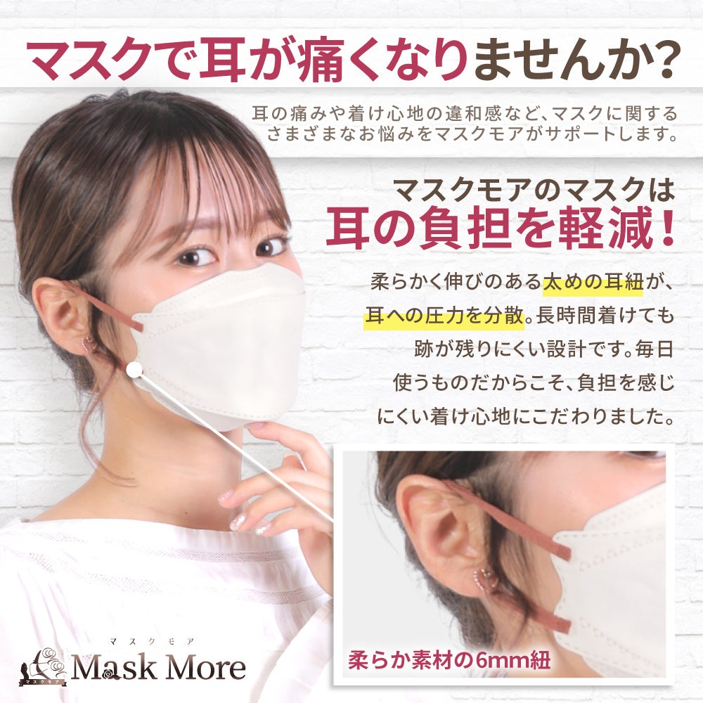 マスクモアの立体マスクは、柔らかく伸びのある太めの耳紐を採用し、耳への圧力を分散することで長時間着用しても負担を感じにくい設計です。