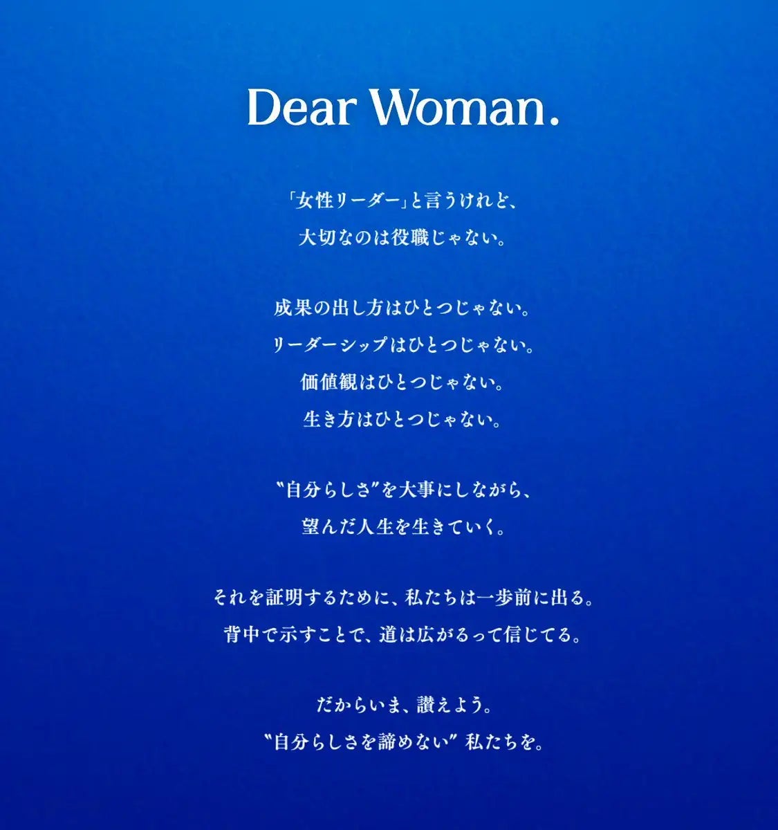 「Dear Woman.」は、 “自分の人生を自分で選び続ける女性”をテーマに、多様な分野で活躍する女性や企業の想い・ストーリーを可視化し、次世代の女性たちへエールを届けるプロジェクトです。