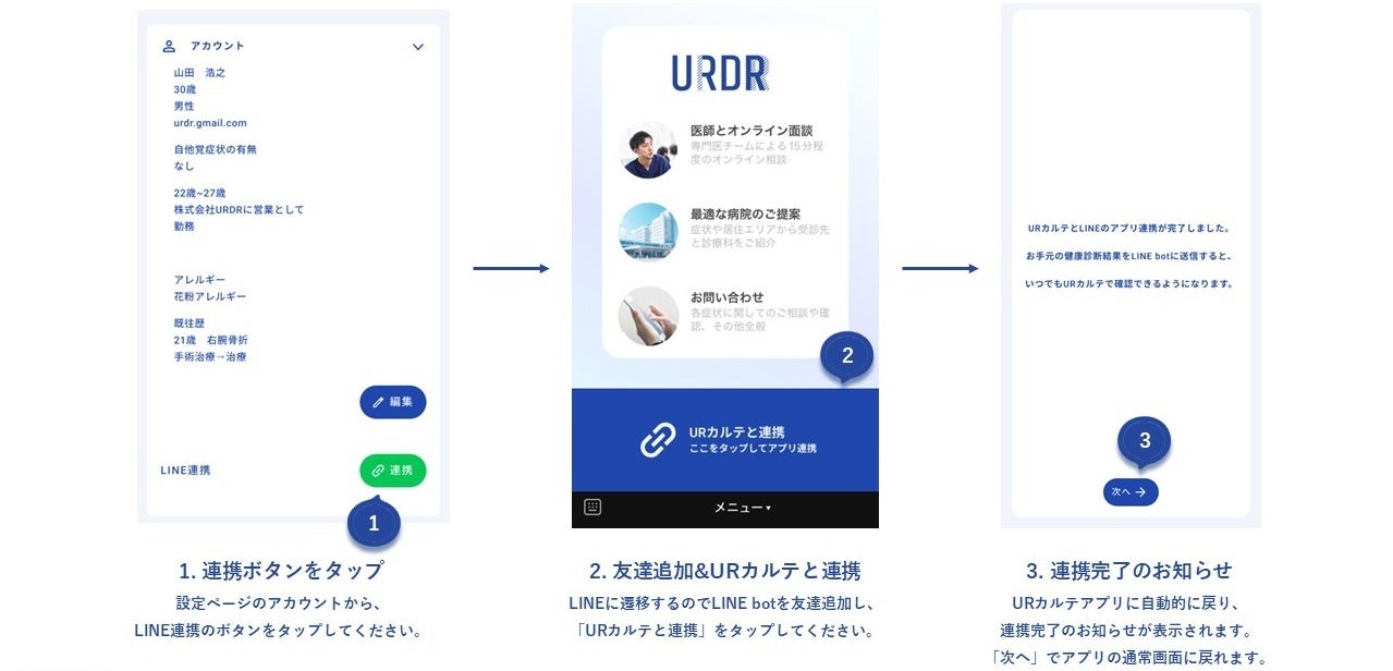 当社は、「働く誰もが重大な疾患を早期発見できる世の中に貢献すること」をMissionとし、キャリアと健康、どちらも諦めない世の中の実現を目指して、法人向け訪問健診及びヘルスケアマネジメントのトータルパッケージサービスである「UR Doctor」を提供して参りました。「UR Doctor」をご利用の法人の従業員等は、医療機関に赴くことなく、ご職場において当社の提携医療機関による医師や看護師による健診及びフィードバックを受けることが可能です。また、当社はAI問診を実装したLINE相談窓口を設けており、医師や看護師などの専門チームに対し、いつでも健康相談を行っていただくことが可能です。