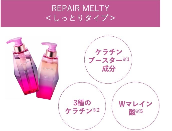 髪になじみやすく、ダメージケアと相性のよい3種のケラチン(※2)と、しっとりとしたまとまり感をもたらすマレイン酸・ジマレイン酸(※3)をバランスよく配合。くせやうねり、ごわつき、広がりが気になるダメージ髪の毛髪内部を補修し、うるおい感のある、まとまりのよい仕上がりへ導きます。