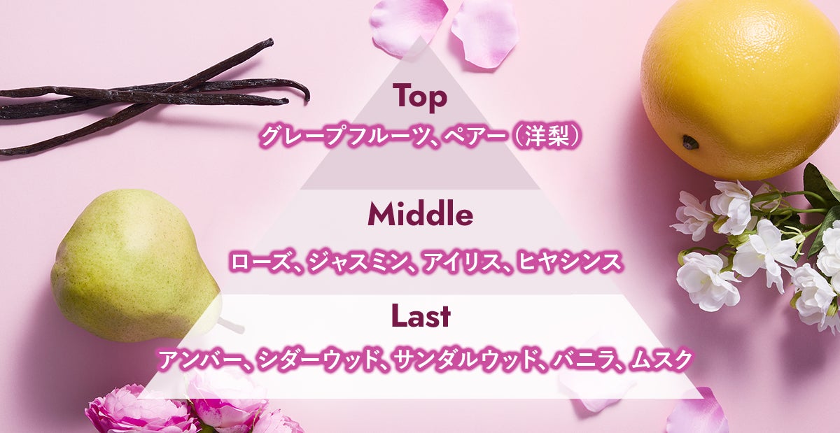 みずみずしいピーチの甘さに、上品なガーデニアが重なり合う、愛されフローラルの香り。